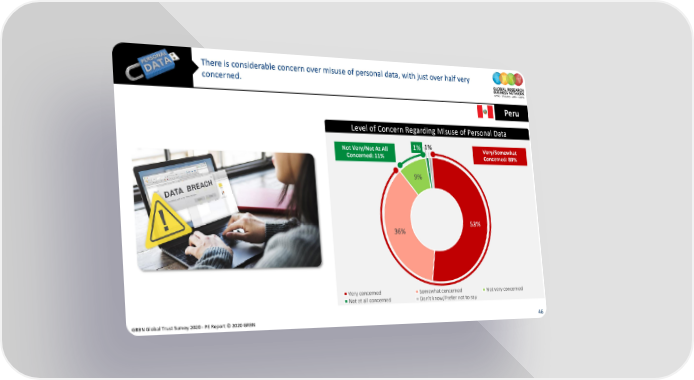 There is considerable concern over misuse of personal data, with just over half very concerned. Peru Level of Concern Regarding Misuse of Personal Data Not Very/Not At All 1% 1% Very/Somewhat Concerned: 11% Concerned: 89% 9% 36% 53% Very concerned Somewhat concerned Not very concerned Not at all concerned Don’t know/Prefer not to say GRBN Global Trust Survey 2020 - PE Report © 2020 GRBN 46
