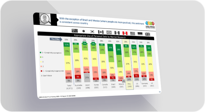 With the exception of Brazil and Mexico (where people are more positive), this sentiment is consistent across country. Appropriate Use of Personal Data by Market Research Top 2 Box 33% 25% 19% 20% 28% 49% 63% 35% 29% 33% 33% 11% 5% 2% 2% 6% 8% 12% 7% 18% 18% 20% 16% 20% 22% 29% 26% 23% 26% 17% 16% 5 – Completely appropriate 4 41% 40% 29% 3 39% 39% 34% 36% 37% 37% 42% 42% 2 30% 1 – Completely inappropriate 18% 14% 17% 16% 2% 29% 18% 24% 14% 11% Don’t Know 9% 8% 9% 5% 19% 6% 24% 5% 7% 7% 10% 4% 9% 9% 5% 9% 7% 3% 1% 10% 10% 10% 6% Total Australia Japan Korea Canada Brazil Mexico Peru US Germany UK (4,971) (500) (498) (501) (521) (503) (505) (500) (496) (495) (452) GRBN Global Trust Survey 2020 - PE Report © 2020 GRBN 59