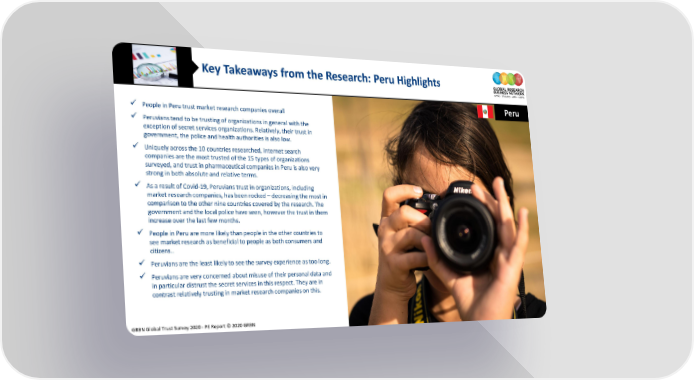 Key Takeaways from the Research: Peru Highlights Peru People in Peru trust market research companies overall Peruvianstendtobetrusting of organizations in general with the exception of secret services organizations. Relatively, their trust in government, the police and health authorities is also low. Uniquely across the 10 countries researched, internet search companies are the most trusted of the 15 types of organizations surveyed, and trust in pharmaceutical companies in Peru is also very strong in both absolute and relative terms. As a result of Covid-19, Peruvians trust in organizations, including market research companies, has been rocked – decreasing the most in comparison to the other nine countries covered by the research. The government and the local police have seen, however the trust in them increase over the last few months. People in Peru are more likely than people in the other countries to seemarketresearchasbeneficial to peopleasbothconsumers and citizens.. Peruvians are theleastlikelyto see the survey experience as too long. Peruvians are very concerned about misuse of their personal data and in particular distrust the secret services in this respect. They are in contrast relatively trusting in market research companies on this. GRBN Global Trust Survey 2020 - PE Report © 2020 GRBN 10