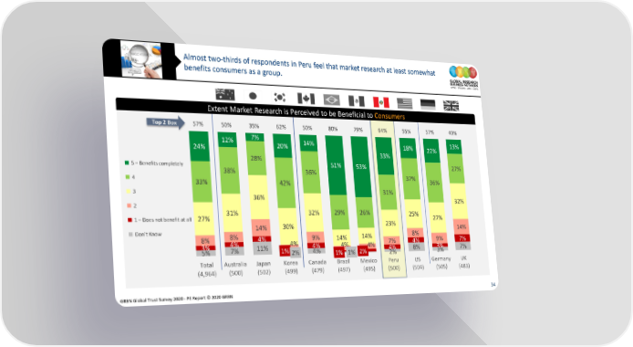 Almost two-thirds of respondents in Peru feel that market research at least somewhat benefits consumers as a group. Extent Market Research is Perceived to be Beneficial to Consumers Top 2 Box 57% 50% 35% 62% 50% 80% 79% 64% 55% 57% 40% 12% 7% 14% 18% 13% 24% 20% 22% 28% 33% 5 – Benefits completely 38% 51% 53% 27% 36% 37% 4 33% 42% 36% 3 36% 31% 2 32% 31% 32% 29% 26% 25% 1 – Does not benefit at all 27% 23% 27% Don’t Know 14% 30% 14% 8% 8% 4% 9% 14% 14% 8% 9% 7% 3% 4% 11% 4% 4% 4% 4% 7% 4% 3% 5% 7% 1% 2% 4% 1% 1% 2% 4% 8% 3% 7% 2% Total Australia Japan Korea Canada Brazil Mexico Peru US Germany UK (4,964) (500) (502) (499) (479) (497) (495) (500) (504) (505) (483) GRBN Global Trust Survey 2020 - PE Report © 2020 GRBN 34