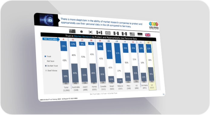 There is more skepticism in the ability of market research companies to protect and appropriately use their personal data in the UK compared to Germany. Trust in Market Research to Protect and Appropriately Use Personal Data Net Trust Index -6 -31 -23 -38 -16 +26 +39 +3 -12 +1 -12 12% 9% 7% 19% 23% 24% 23% 23% 23% 41% 51% 40% 45% Trust 53% 41% 35% 38% Not Sure 43% 50% 52% Do Not Trust 42% Don’t Know 37% 44% 32% 45% 35% 35% 35% 30% 21% 22% 15% 11% 4% 4% 5% 3% 5% 3% 1% 5% 7% 3% 4% Total Australia Japan Korea Canada Brazil Mexico Peru US Germany UK (5,036) (500) (498) (501) (521) (503) (505) (500) (496) (495) (517) Net Trust Index = % Trust – % Do Not Trust GRBN Global Trust Survey 2020 - UK Report © 2020 GRBN 53
