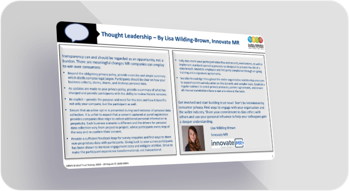 Thought Leadership – By Lisa Wilding-Brown, Innovate MR transparency can and should be regarded as an opportunity, not a • Fully document your participant data flow and security mechanisms, as well as burden. There are meaningful changes MR companies can employ implement standard operating procedures designed to prevent the risk of a to win over consumers: data breach. Mandate employee and 3rd-party compliance through on-going training and e-signature agreements. • Beyond the obligatory privacy policy, provide a concise and simple summary • Socialize knowledge throughout the entire organization and develop processes which distills complex legal jargon. Participants should be clear on how your to support continued education on this dynamic and complex topic. Establish a business collects, stores, shares, and destroys personal data. regular cadence to revisit privacy protocols, partner agreements, and ensure • As updates are made to your privacy policy, provide a summary of what has all internal stakeholders have a seat and voice at the table. changed and provide participants with the ability to review historic versions. • Be explicit – provide the purpose and need for this data and how it benefits Get involved and start building trust now! Don’t be intimidated by not only your company, but the participant as well. consumer privacy. Find ways to engage with your organization and • Ensure that an active opt-in is presented during each instance of personal data the wider industry. Share your commitment to data ethics with collection. It is unfair to expect that a consent captured at panel registration others and use your personal influence to help your colleagues gain provides companies free reign to collect additional personal information in a deeper understanding. perpetuity. Each business scenario is different and the drivers for personal data collection vary from project to project; advise participants every step of Lisa Wilding-Brown the way and re-confirm their consent. • Provide a sufficient feedback loop for survey enquiries and find ways to share Innovate MR non-proprietary data with participants. Giving back to your survey participants has been shown to increase engagement rates and mitigate attrition. Strive to make the participant experience transformational, not transactional. GRBN Global Trust Survey 2020 - US Report © 2020 GRBN 7