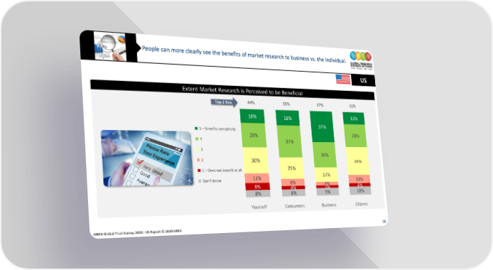 People can more clearly see the benefits of market research to business vs. the individual. US Extent Market Research is Perceived to be Beneficial Top 2 Box 44% 55% 67% 42% 16% 18% 15% 5 – Benefits completely 37% 28% 28% 4 37% 3 30% 2 30% 34% 1 – Does not benefit at all 25% 11% 17% Don’t Know 8% 4% 10% 8% 4% 3% 4% 8% 8% 9% 10% Yourself Consumers Business Citizens GRBN Global Trust Survey 2020 - US Report © 2020 GRBN 38