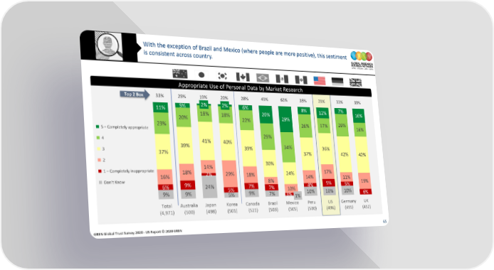 With the exception of Brazil and Mexico (where people are more positive), this sentiment is consistent across country. Appropriate Use of Personal Data by Market Research Top 2 Box 33% 25% 19% 20% 28% 49% 63% 35% 29% 33% 33% 11% 5% 2% 2% 6% 8% 12% 7% 18% 18% 20% 16% 20% 22% 29% 26% 23% 26% 17% 16% 5 – Completely appropriate 4 41% 40% 29% 3 39% 39% 34% 36% 37% 37% 42% 42% 2 30% 1 – Completely inappropriate 18% 14% 17% 16% 2% 29% 18% 24% 14% 11% Don’t Know 9% 8% 9% 5% 19% 6% 24% 5% 7% 7% 10% 4% 9% 9% 5% 9% 7% 3% 1% 10% 10% 10% 6% Total Australia Japan Korea Canada Brazil Mexico Peru US Germany UK (4,971) (500) (498) (501) (521) (503) (505) (500) (496) (495) (452) GRBN Global Trust Survey 2020 - US Report © 2020 GRBN 65
