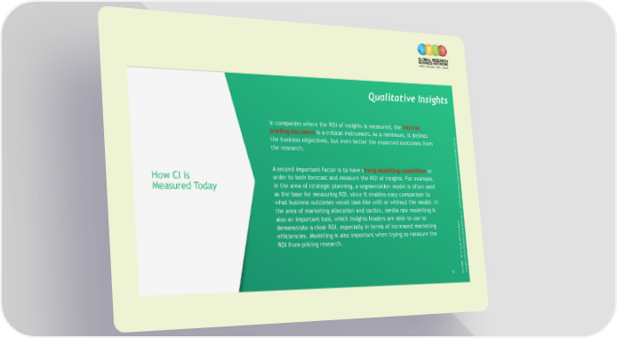 Qualitative Insights In companies where the ROI of Insights is measured, the internal briefing document is a critical instrument. As a minimum, it defines the business objectives, but even better the expected outcomes from the research. All rights reserved. How CI is A second important factor is to have strong modelling capabilities in order to both forecast and measure the ROI of Insights. For example, Measured Today in the area of strategic planning, a segmentation model is often used esearch Business Network. as the base for measuring ROI, since it enables easy comparison to what business outcomes would look like with or without the model. In The Global R the area of marketing allocation and tactics, media mix modelling is also an important tool, which Insights leaders are able to use to demonstrate a clear ROI, especially in terms of increased marketing eport efficiencies. Modelling is also important when trying to measure the ROI from pricing research. The Boston Consulting Group, Inc. and 0 BCG GRBN - ROI of Insight 2017 Study RCopyright © 2017 by