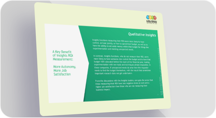 Qualitative Insights Insights functions measuring their ROI seem more likely to have control, at least jointly, on how to spend their budget, as well as to have the ability to set aside money within that budget for things like experimentation and meeting unexpected needs. A Key Benefit All rights reserved. of Insights ROI In contrast, Insights functions, who do not measure their ROI, seem Measurement: more likely to have someone else control the budget and to have that budget 100% allocated before the start of the financial year, making More Autonomy, experimentation with new tools and techniques almost impossible. In esearch Business Network. these companies, if unexpected needs do arise then the requester More Job needs to find the budget themselves, with the result that sometimes The Global R Satisfaction important research does not get undertaken. From the discussions with the Insights leaders, one gets the sense that eport those measuring their ROI have less negative stress at work and a higher job satisfaction than those who are not measuring their The Boston Consulting Group, Inc. and business impact. 7 BCG GRBN - ROI of Insight 2017 Study RCopyright © 2017 by