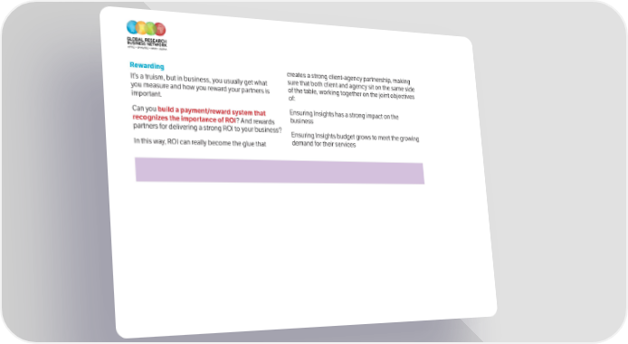 Rewarding creates a strong client-agency partnership, making It’s a truism, but in business, you usually get what sure that both client and agency sit on the same side you measure and how you reward your partners is of the table, working together on the joint objectives important. of: Can you build a payment/reward system that Ensuring Insights has a strong impact on the recognizes the importance of ROI? And rewards business partners for delivering a strong ROI to your business? Ensuring Insights budget grows to meet the growing In this way, ROI can really become the glue that demand for their services