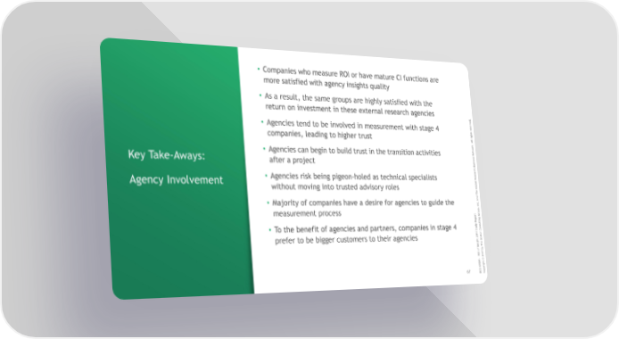 • Companies who measure ROI or have mature CI functions are more satisfied with agency insights quality • As a result, the same groups are highly satisfied with the return on investment in these external research agencies . d e v r e s e r • Agencies tend to be involved in measurement with stage 4 s t h g i r l companies, leading to higher trust l A . k r o w t e • Agencies can begin to build trust in the transition activities N s s e n i Key Take-Aways: s after a project u B ch r a e s e • Agencies risk being pigeon-holed as technical specialists R l a Agency Involvement b o l G without moving into trusted advisory roles e Th d n a • Majority of companies have a desire for agencies to guide the c. n I , p u o measurement process t r r G o p g e n i R t l y u d s u n • To the benefit of agencies and partners, companies in stage 4 t Co S 7 n 1 o 0 t 2 s prefer to be bigger customers to their agencies o t B ghe i s Th In y f b o 7 OI 1 R 0 2 - © N B t h g i GRr G y C p 67 B Co