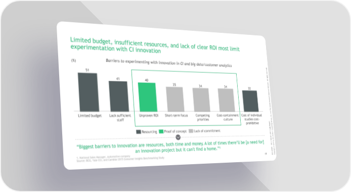 Limited budget, insufficient resources, and lack of clear ROI most limit experimentation with CI innovation Barriers to experimenting with innovation in CI and big data/customer analytics . (%) d e v r e s e r s t 51 h g i r l l A . k 41 r 40 o w t 35 e 34 34 N 32 s s e n i s u B ch r a e s e R l a b o l G e Th d n a Limited budget Lacksufficient Unproven ROI Short-termfocus Competing Cost-containment Cost of individual c. n I , p staff priorities culture studies cost- u o t r r G o prohibitive p g e n i R t l y u d s u n t Co Resourcing Proof of concept Lack of commitment S 7 n 1 o 0 t 2 s o t B ghe i s Th In y f b o “Biggest barriers to innovation are resources, both time and money. A lot of times there’ll be [a need for] 7 OI 1 R 0 2 - 1 © N an innovation project but it can't find a home.” B t h g i 1. National Sales Manager, Automotive company GRr G y Source: BCG, Yale CCI, and Cambiar 2015 Consumer Insights Benchmarking Study 9 C p 11 B Co