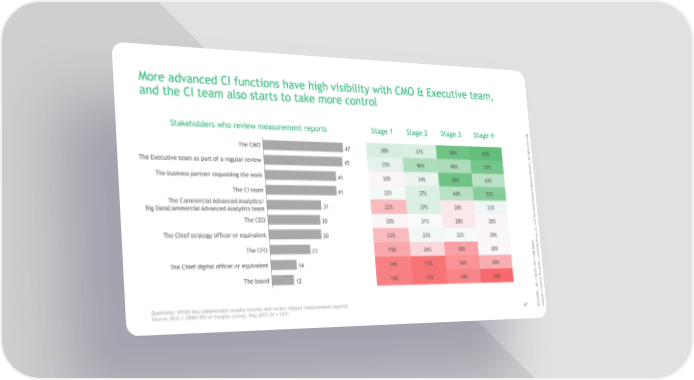 More advanced CI functions have high visibility with CMO & Executive team, and the CI team also starts to take more control . d Stakeholders who review measurement reports Stage 1 Stage 2 Stage 3 Stage 4 e v r e s e r s t h g The CMO i 47 r 38% 37% 58% 60% l l A . k r The Executive team as part of a regular review o 45 35% 46% 46% 57% w t e N s s e The business partner requesting the work n 41 30% 34% 58% 43% i s u B ch r The CI team 41 32% 37% 44% 53% a e s e R l The Commercial Advanced Analytics/ a b o 31 22% 37% 28% 33% l Big DataCommercial Advanced Analytics team G e Th The CEO d 30 30% 31% 28% 30% n a c. n I , The Chief strategy officer or equivalent 30 22% 33% 32% 30% p u o t r r G o p g e n i The CFO R t 23 19% 26% 18% 30% l y u d s u n t Co S 7 n The Chief digital officer or equivalent 14 14% 11% 16% 20% 1 o 0 t 2 s o t B ghe i The board s Th 12 14% 11% 14% 10% In y f b o 7 OI 1 R 0 2 - © N B t h g i GRr Questions: Which key stakeholders usually receive and review impact measurement reports? G y C p Source: BCG / GRBN ROI of Insights survey, May 2017 (N = 187) 47 B Co