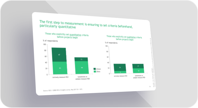 The first step to measurement is ensuring to set criteria beforehand, particularly quantitative Those who explicitly set quantitative criteria Those who explicitly set qualitative criteria . d e v r e before projects begin before projects begin s e r s t h g i r % of respondents % of respondents l l A . k r 100 100 o w t e N s s e n i s 80 80 u B ch r a e 47 s e R 60 60 l a b o l 13 G e Th 40 40 d n a c. n I 17 , p 44 26 u 43 o 20 20 t r Always r G o p g e n i R t Often 18 l y u d s 9 u n t Co 0 0 S 7 n 1 o 0 t 2 s Actively measure ROI Sometimes or Actively measure ROI Sometimes or o t B ghe seldom measure ROI seldom measure ROI i s Th In y f b o 7 OI 1 R 0 2 - © N B t h g i GRr G y C p Source: BCG / GRBN ROI of Insights survey, May 2017 (N = 187) 54 B Co