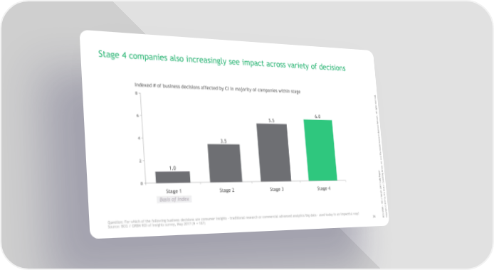 Stage 4 companies also increasingly see impact across variety of decisions Indexed # of business decisions affected by CI in majority of companies within stage . d e v r e 8 s e r s t h g i r l l A . k r 6.0 o w t 6 e 5.5 N s s e n i s u B ch r a e s 4 e R 3.5 l a b o l G e Th d n a 2 c. n I , p 1.0 u o t r r G o p g e n i R t l y u d s 0 u n t Co S 7 n 1 o 0 t Stage 1 Stage 2 Stage 3 Stage 4 2 s o t B gh e i Basis of index s Th In y f b o 7 OI 1 R 0 2 - © N B t h g i GR r Question: For which of the following business decisions are consumer insights – traditional research or commercial advanced analytics/big data – used today in an impactful way? G y C p Source: BCG / GRBN ROI of Insights survey, May 2017 (N = 187) 34 B Co