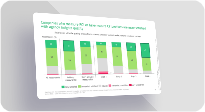 Companies who measure ROI or have mature CI functions are more satisfied with agency insights quality Satisfaction with the quality of insights in external consumer insight/market research vendors or partners . d e v Respondents (%) r e s e r s t h g i 11 r 16 l 17 l A 22 26 . k 31 r o w t 47 e N s s 41 e n i s u B ch 52 r 59 a e 53 s e R l a 60 b 55 o l G e Th 43 d n a c. n I , p u o t r r G o p g e n i R t l y u d s u n t Co S All respondents Actively Don’t actively Stage 1 Stage 2 Stage 3 Stage 4 7 n 1 o 0 t 2 s measure ROI measure ROI o t B gh e i s Th In y f b o 7 OI 1 R 0 Very satisfied Somewhat satisfied Neutral Somewhat unsatisfied Very unsatisfied 2 - © N B t h g i GR r Questions: A1: How satisfied are you with the quality of insights from your external consumer insight/market research vendors or partners? G y C p Source: BCG / GRBN ROI of Insights survey, May 2017 (N = 187) 71 B Co
