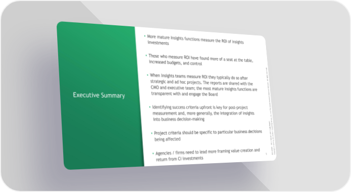 • More mature Insights functions measure the ROI of insights investments • Those who measure ROI have found more of a seat at the table, increased budgets, and control . d e v r e s e r s t h g i r l • When Insights teams measure ROI they typically do so after l A . k r strategic and ad hoc projects. The reports are shared with the o w t e N s s CMO and executive team; the most mature Insights functions are e n i s u B transparent with and engage the Board ch r a Executive Summary e s e R l a b o l G • Identifying success criteria upfront is key for post-project e Th d n a measurement and, more generally, the integration of Insights c. n I , p into business decision-making u o t r r G o p g e n i R t l y u d s u n t Co S • Project criteria should be specific to particular business decisions 7 n 1 o 0 t 2 s o t B ghe being affected i s Th In y f b o 7 OI 1 R 0 2 - © N B t h g • Agencies / firms need to lead more framing value creation and i GRr G y C p return from CI investments 5 B Co