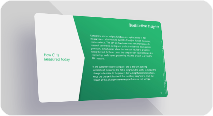 Qualitative Insights Companies, whose Insights functions are sophisticated in ROI . d measurement, also measure the ROI of Insights through measuring e v r e s e r cost avoidance. This can be clearly demonstrated with respect to s t h g i r research carried out during new product and service development l l A . k r processes, in such cases where the research has led to a project o w t e N being shelved. In these cases, the company can easily estimate the s s e n i s cost savings made by not proceeding with the project as a Insights u B How CI is ch r ROI measure. a e s e Measured Today R l a b o l G e Th In the customer experience space, one of the keys to being d n a c. n successful at measuring the ROI of Insights is the ability to isolate the I , p u o change to be made to the process due to Insights recommendations. t r r G o p g e n i R t Once the change is isolated it is a relatively easy task to track the l y u d s u n t Co S impact of that change on revenue growth and/or cost savings. 7 n 1 o 0 t 2 s o t B ghe i s Th In y f b o 7 OI 1 R 0 2 - © N B t h g i GRr G y C p 52 B Co