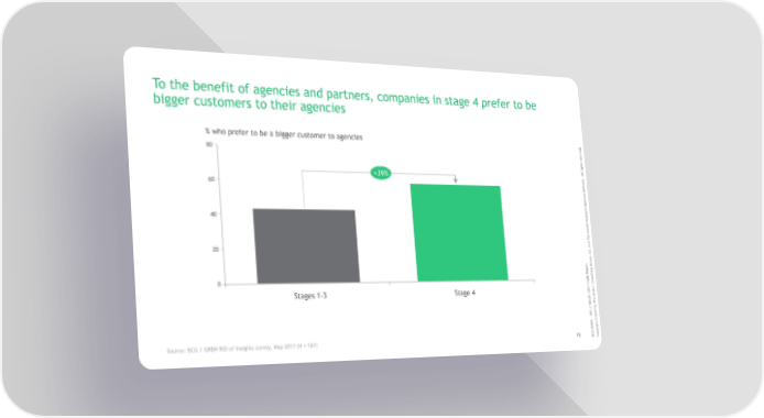 To the benefit of agencies and partners, companies in stage 4 prefer to be bigger customers to their agencies % who prefer to be a bigger customer to agencies . d e v r e 80 s e r s t h g i r l l A . +39% k r o w 60 t e N s s e n i s u B ch r a e s 40 e R l a b o l G e Th d n a 20 c. n I , p u o t r r G o p g e n i R t l y u d s 0 u n t Co S 7 n 1 o 0 t Stages 1-3 Stage 4 2 s o t B ghe i s Th In y f b o 7 OI 1 R 0 2 - © N B t h g i GRr G y C p Source: BCG / GRBN ROI of Insights survey, May 2017 (N = 187) 78 B Co
