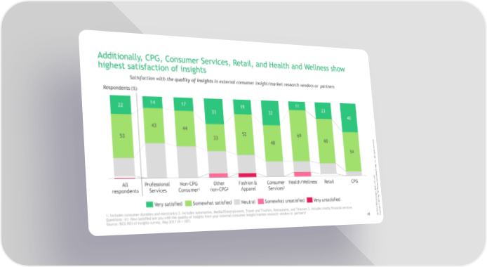 Additionally, CPG, Consumer Services, Retail, and Health and Wellness show highest satisfaction of insights Satisfaction with the quality of insights in external consumer insight/market research vendors or partners Respondents(%) 22 14 17 19 11 23 33 32 40 43 44 53 52 69 . 33 60 d ve 48 r e s e r s t 54 h ig r l Al . c n I p, u o Gr g n i t x l t u p s p n All Professional Non-CPG Other Fashion& Consumer Health/Wellness Retail CPG Co n _v23.o 1 2 3 t t respondents Services Consumer non-CPG Apparel Services f s a r Bo _de t Th ghy sib n I 7 Very satisfied Somewhat satisfied Neutral Somewhat unsatisfied Very unsatisfied f o I 201 RO© 7 t 1. Includes consumer durables and electronics 2. Includes Automotive, Media/Entertainment, Travel and Tourism, Restaurants, and Telecom 3. Includes mostly financial services 1 h ig r Questions: A1: How satisfied are you with the quality of insights from your external consumer insight/market research vendors or partners? y p 41 o Source: BCG ROI of insights survey, May 2017 (N = 187) 73 201707C